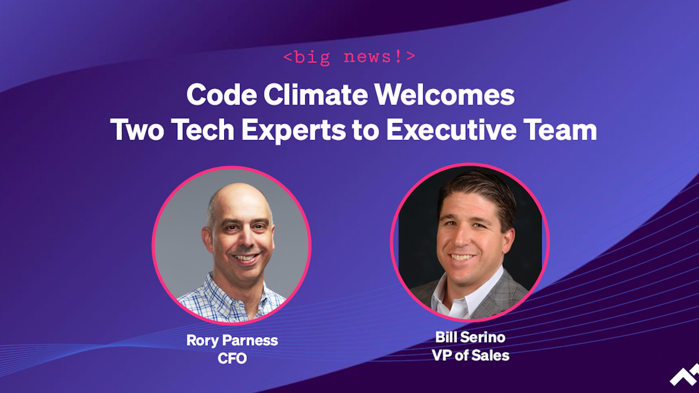 Code Climate, the leader in Engineering Intelligence, today announced two key strategic hires, naming Rory Parness as CFO and Bill Serino as VP of Sales. These tech industry veterans join Code Climate as the company gains momentum on the heels of a successful Series C round of funding closed in August.