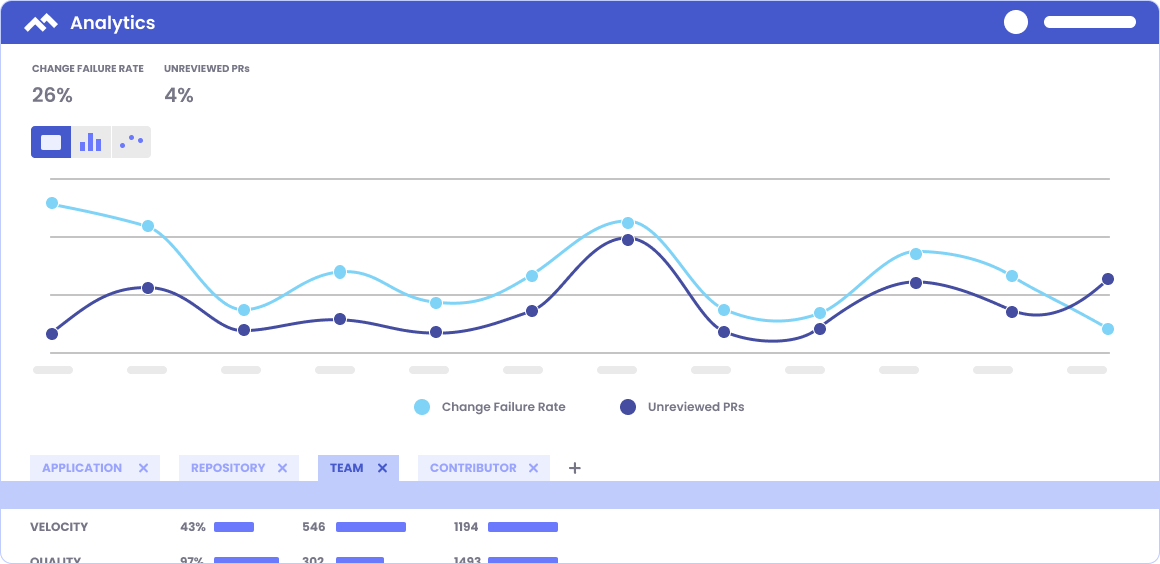 In Velocity’s Analytics module, choose Unreviewed PRs and Change Failure Rate to see the relationship between the two metrics. If you notice a high Change Failure Rate correlates to a high percentage of Unreviewed PRs, you have a basis for adjusting processes to prevent Unreviewed PRs from being merged.