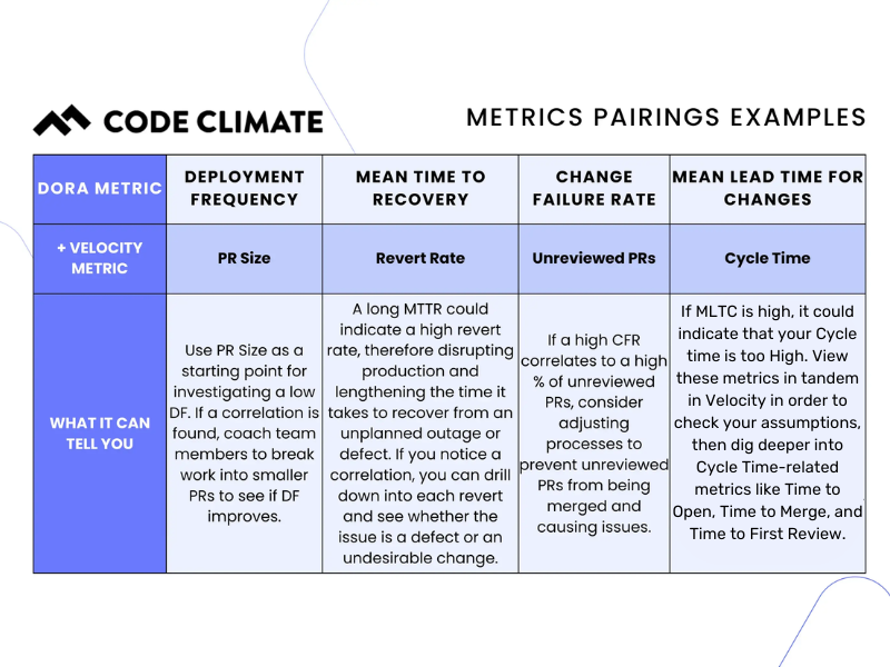 To do this, they can add context to the four DORA metrics and pair them with complementary metrics to get more insight into what’s happening with individual teams and what improvements might be useful. Common metrics pairings include: